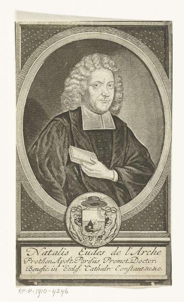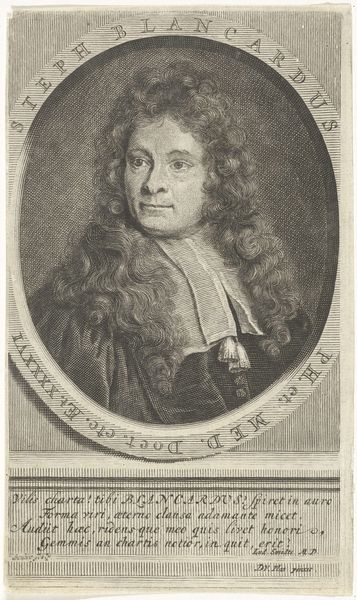 Editor: This is a 17th-century engraving, "Portret van Johann Risselmann". The subject looks every bit the important scholar of the Baroque era that the inscription details. What strikes me, looking at the engraving, is the sheer labor that went into creating this image, the intricate details etched into the metal. How does the materiality of the piece inform its meaning? Curator: Exactly! Think about the social context in which this portrait was produced. Engravings like these were instrumental in disseminating images and ideas, and acted as vehicles for prestige. The production process itself, the skilled labor required to create such a detailed image on a metal plate, elevates Risselmann's status. Consider how the reproducibility of engraving facilitated a wider distribution of his likeness, impacting his intellectual influence and social standing. Editor: So, the engraving medium is less about artistry and more about utility, tied to production and distribution? Does the "original" artwork still matter if its purpose is to create copies? Curator: Not necessarily "less about artistry", but definitely interwoven with the burgeoning print culture and the demands of portraiture in a commercial context. This challenges a simplistic division between "art" and "craft". We have to consider how the material process of engraving helped create a demand for repeatable images, influencing artistic practices and perceptions of value. The very act of multiplication shapes the social function of the image. Does it feel democratic, elitist, informative or propagandistic to you? Editor: It makes me think of social media and how images now gain value through likes and shares! The engraving allowed this scholar's image to reach further than it could before mass printing. Thank you; I now have a completely different perspective on engravings and their context. Curator: And understanding that material connection to social conditions and artistic creation enriches our appreciation of art's purpose in shaping cultural attitudes, now and then.