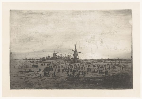 Ludovic-Napoléon Lepic made this etching, "Dutch Winter Landscape with Windmills and Skaters" sometime in the late 19th century. It's an image that evokes the romanticism of rural life, but it also speaks to broader social and economic shifts. Think about the setting: windmills, a frozen landscape, and figures skating. These elements aren't just picturesque; they reflect the Netherlands' reliance on wind power, its struggle with water, and the recreational activities of its people. By the late 1800s, industrialization and urbanization were rapidly changing European society. Did Lepic want to remind viewers of a simpler time? Was he trying to capture a way of life that was already disappearing? To fully understand this image, we'd need to delve into Dutch history, looking at the relationship between the people and the land, and also considering the rise of tourism. Art history is about connecting the artwork to the world in which it was made.