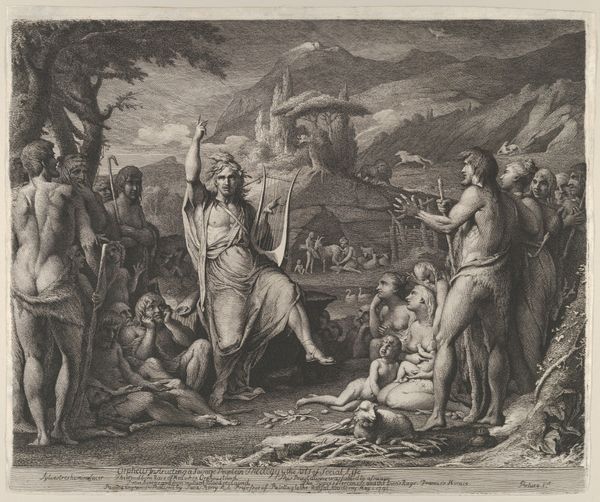 Curator: This drawing by Nicolaes van Helt Stockade is called "Sophonisbe nimmt den Giftbecher," which translates to "Sophonisba Takes the Poison Cup." Editor: The monochromatic palette creates an overall somber, almost ghostly feeling, don't you think? Curator: Absolutely. Stockade is depicting the moment Sophonisba, a Carthaginian noblewoman, chooses suicide over Roman captivity during the Second Punic War. The tragedy lies in her conflicted loyalties and the immense political pressure exerted on her. Editor: The architectural background, that imposing structure reminiscent of Egyptian pyramids, is striking. How does that tie into the narrative? Curator: It symbolizes Sophonisba's exotic origins, and it contrasts the familiar classical structures of Roman power with the perceived opulence and otherness of Carthage, reinforcing her status as an outsider in Roman eyes. Editor: And the way Stockade employs light and shadow definitely enhances the drama. The stark contrasts amplify the gravity of Sophonisba's choice, making her the focal point as the eye immediately gravitates to the cup and her face. Curator: The figure of Sophonisba here embodies female agency within a male-dominated world, even if that agency manifests in her control over her own death. It’s a potent symbol that resonated throughout history, particularly within contexts where ideas of liberty and sacrifice were central. The museum acquired this drawing precisely because it provides invaluable insights into the complex negotiations of power and representation during its time. Editor: For me, the texture is very interesting. The variations in the ink wash gives the composition dynamism; note also the faint chalk or pencil underdrawing which shows his preparation for rendering the dramatic event so meticulously. I see his skillful use of mixed media adds real depth and volume. Curator: It's a piece filled with socio-political messages—an ideal depiction of resistance against Roman power, shaped and promoted by Dutch visual traditions. Editor: From its somber tones to its architectural backdrop, every aspect is meticulously constructed to maximize emotional and dramatic impact. It definitely makes for a compelling viewing experience.