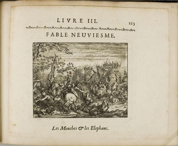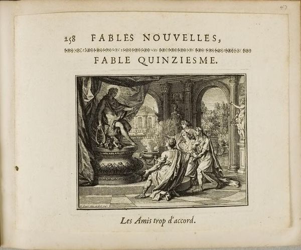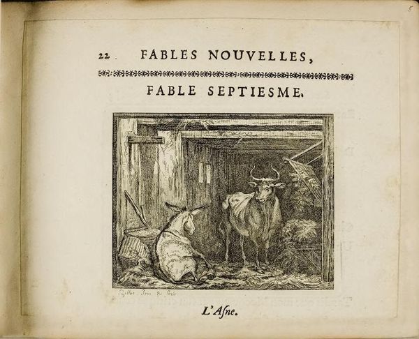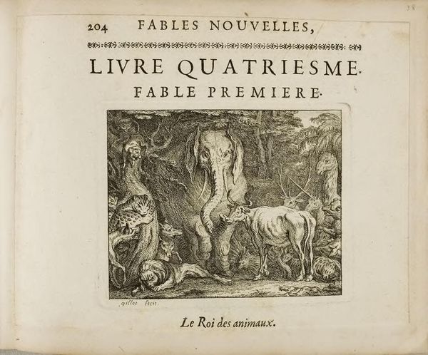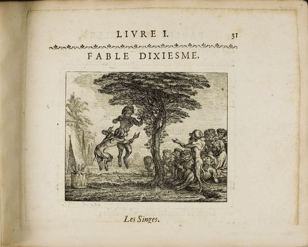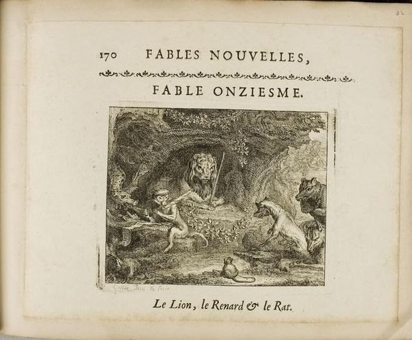 Curator: Claude Gillot's etching, "The Animal Comedians," presents a curious scene, doesn't it? The plate itself is quite small, only about 8 by 10 centimeters. Editor: It feels like a stage production—darkly comical. The animals are arranged almost like actors awaiting their cues. The fox in the crown particularly captures my attention. Curator: Gillot, working in the late 17th and early 18th centuries, often explored theatrical themes. The etching process itself—the labor of incising the image onto the metal plate, then printing it—mirrors the staged artificiality. Editor: The density of the lines adds to that sense of crafted unreality. It makes me think about the human desire to project our own dramas onto the natural world. Curator: Absolutely, and the choice of animals... the dog, the lion, the fox... each carries a set of pre-packaged associations, ripe for comedic subversion. Editor: It does prompt reflection on our relationship with the natural world and how we construct narratives around it. I appreciate how Gillot uses this fable to question the roles we assign.
