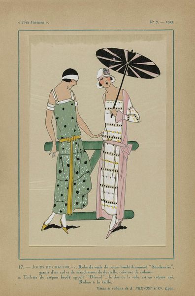Curator: This is Ralph Barton’s "The Lie of the Last Minstrel," a print created around 1917. Editor: Immediately, it strikes me as melancholic masquerade! All those stiff angular figures—so stylized—almost like a dream dipped in absinthe. Curator: Barton was a fascinating character. Known for his caricatures and illustrations during the Jazz Age, he captured the social scene, celebrity culture, and underlying anxieties of that era. This work really shows you the confluence of art nouveau, symbolism, and decorative arts that define his output. It's a print, so mass production and dissemination of images was key to his work. Editor: There's an odd disconnect...the vibrant color palette, especially that juicy orange in contrast to the purple...suggests frivolity. Yet, the figures’ expressions, or lack thereof, hint at a deeper, more complex narrative—the ‘lie’ maybe? That flattening is quite haunting. Is that naive art element intentional, would you say, to create this kind of surreal stage? Curator: Absolutely, it’s important to look at how the image was circulated, consumed, and by whom. Consider the social circles these images might have traversed and the statement they made. Mass-produced art makes luxury available across the socio-economic spectrum. It opens up aesthetic experiences to people previously excluded. Editor: Yes, democratizing art, or maybe it’s that democratizing tragedy? It does feel vaguely unsettling, almost mocking some sort of elite sensibility, or maybe reflecting a cynical disillusionment of the time...like everyone's in costume even when they're not at a party. And technically, the flatness you mentioned earlier combined with decorative elements is what makes that reading even more prominent. It's a captivating dance of light and shadow, isn't it? Even though the drawing shies away from defining shadow in a realistic sense. Curator: Barton used printmaking processes not just for visual reproduction but also to critique and reflect the emerging industrial, social conditions of the modern world. The flatness speaks to its context. Editor: It does. Thinking about how this image made it into the world makes it linger, and maybe makes that lie just a bit harder to swallow, you know? Curator: Agreed, it's more than just aesthetic pleasure, it's about the machinery and conditions that allow that pleasure to be broadly accessible.