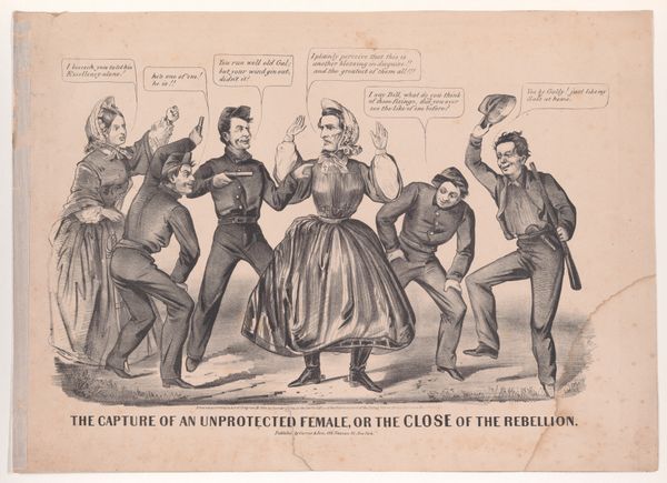 Benjamin Henry Day Jr. created this lithograph, Caving In, or a Rebel "Deeply Humiliated," using ink on paper. Lithography, a printmaking process, relies on the chemical repulsion between oil and water. The artist draws an image on a stone or metal plate with a greasy medium, then applies ink that adheres only to the drawn areas. This allows for the creation of multiple copies, making it perfect for distributing political cartoons like this one. The stark contrast of the black ink on the white paper immediately conveys a sense of conflict, highlighting the intensity of the boxing match between Abraham Lincoln and Jefferson Davis. The graphic nature of the print, with its bold lines and exaggerated features, serves to emphasize the political message, turning the leaders into caricatures for mass consumption. Day's choice of lithography underscores the power of print media in shaping public opinion and fueling the debates of the Civil War era. It is a reminder that even seemingly simple materials and processes can carry significant cultural and political weight.