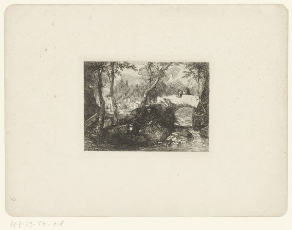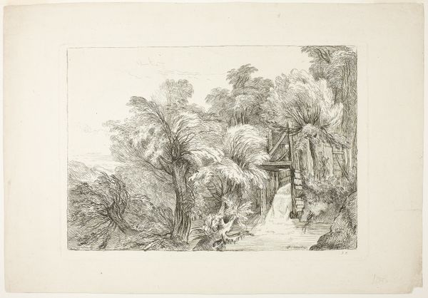 Editor: We're looking at "Landscape with a White House" by Christoph Nathe, an etching from between 1763 and 1806. I’m struck by its intimacy; it feels like a hidden place. How do you interpret this work? Curator: For me, this print embodies the Romantic era's fascination with nature, but we need to look closer at the socio-political context of the time. Consider the rise of nationalism and the idealized vision of rural life. How might this "white house," seemingly modest, function as a symbol of ownership and perhaps even power dynamics? Editor: I hadn’t considered it in terms of power, just as an idyllic scene. Curator: Precisely! And that’s where critical art history comes in. Let’s think about whose land this is, who is excluded from this picture of domestic tranquility? Who gets to feel peace in the landscape, and who does not? The clean lines and cultivated trees point to control over the environment, reflecting Enlightenment ideals imposed on nature. Editor: So, it’s not just a pretty picture but a statement about the relationship between humanity and nature and a social hierarchy at the time? Curator: Exactly! And think, too, about the print medium itself. It’s reproducible, shareable, democratizing art...to some. We still need to ask, "who has access?" It serves as a visual document of the prevailing ideologies, one which is open for questioning and re-evaluation. Editor: I see it so differently now. It is a much more complex image than I thought it was when I started looking. Curator: Art allows us to investigate history and reimagine the world, to ask more interesting questions and seek more thorough, socially conscious answers.