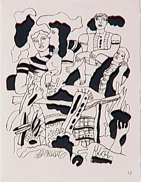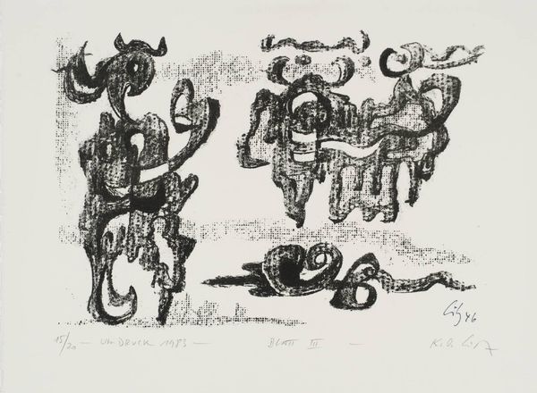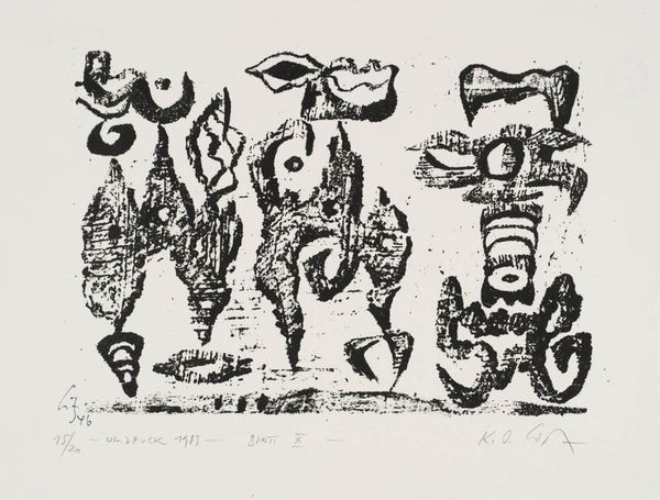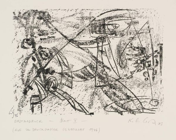 Curator: Looking at this print by Professor Karl-Otto Götz, created in 1946, one immediately observes a network of lines and shapes rendered in stark black ink. Editor: It feels like a dance, or maybe a deconstruction. The shapes are so angular and jagged, yet they have a kind of rhythm. Curator: The process here is key; it's a print, likely a lithograph given the date and the paper, allowing for the replication of these spontaneous-looking marks. Think of the artist's hand, the pressure, the transfer. Editor: Exactly! And the texture, that slight graininess, it gives the piece a raw, almost urgent energy. It’s as if Götz was trying to capture a fleeting thought. It's like the art itself is materializing right before our eyes. Curator: Well, considering it was made shortly after the war, the fractured forms might reflect the shattered state of Europe, questioning established modes of representation. Editor: I see that. But I also feel the freedom in it, the act of breaking things down to build something new. It’s not just about destruction, but about potential. Curator: Indeed. It reveals how materials and techniques can convey powerful social and personal narratives. Editor: Exactly. Sometimes the most powerful statements are the ones that aren't immediately obvious. This piece keeps whispering different possibilities.