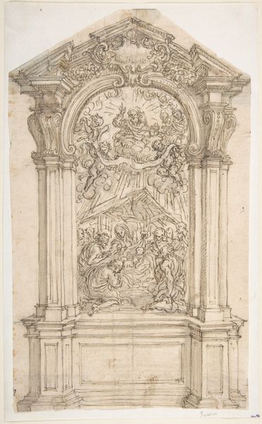 This is Johann Baptist Zimmermann’s sketch of an altar. Zimmermann, born in 1680, was a prominent painter and architect in the Baroque period, a time of great social and religious upheaval. His work often served the Catholic Church, visually reinforcing its power and spiritual authority. Notice the ornate detailing of the altar, a key feature of Baroque art designed to inspire awe and devotion. These details reflect the hierarchical structure of the church and society at the time, where religious institutions held significant sway over people's lives. Consider how this sketch translates the power dynamics of the era into an architectural form. Zimmermann captures the emotional intensity of religious experience, aiming to create a space that elevates the faithful towards the divine. This sketch not only represents an altar but also serves as a historical artifact, revealing the complex interplay between art, religion, and social class in Baroque society. It invites us to reflect on the enduring influence of religious architecture on our cultural landscape.