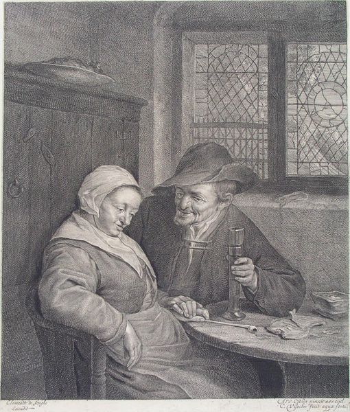 Pieter Schenk created this small engraving, “Old Couple,” around the turn of the 18th century. Immediately, you’re drawn to the composition's stark contrasts of light and shadow, a hallmark of the engraving medium. Schenk uses this to full effect, casting the old man’s gleeful expression in sharp relief against the soft, almost melancholic depiction of the woman. The work is structured around a table, a horizontal plane that divides the visual field and serves as a stage for the interaction between the two figures. This structure highlights a tension between the male and female figures. In line with semiotic understanding, the elements of pipe, glass and window signify a wider social reality. It destabilizes established meanings of beauty and desire, suggesting an alternative view of affection rooted in shared experience rather than idealised forms. The piece challenges fixed notions of beauty, inviting an ongoing interpretation of its themes.
