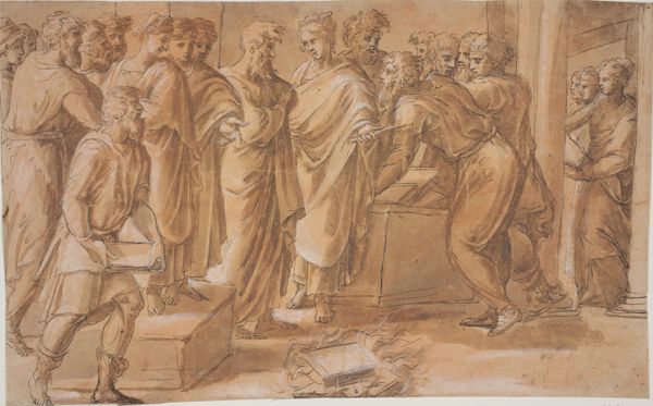 Abraham van Diepenbeeck made this drawing called ‘The Adoration of the Kings’ using pen and brown ink, with a brush in gray wash. The material’s influence on the artwork's appearance is remarkable; the brown ink and gray wash give the drawing its tonal qualities. The artist meticulously uses the pen to create fine lines and intricate details, seen in the king's garments and facial expressions. The use of brush and gray wash softens the image, adding depth and volume to the figures, and creating a sense of atmosphere. The process involves skill and control, using hatching and cross-hatching to build up shadows and define forms. This technique is rooted in a long tradition of drawing and printmaking. The amount of labor is evident in the details of the figures and their clothing. This drawing serves as a reminder of the significance of materials, making, and context in fully grasping an artwork's meaning, and challenges the traditional separation between fine art and craft.