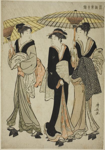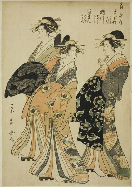 Editor: This woodblock print, "Three Courtesans Under a Cherry Tree" by Eishō, from the 1790s, is just stunning. I'm drawn to the patterns and how they define the figures. How would you interpret this work? Curator: Focusing on its formal elements, observe the sophisticated interplay of line, color, and pattern. Eishō masterfully orchestrates these elements. Consider the sinuous outlines of the figures juxtaposed with the delicate, almost ethereal blossoms of the cherry tree. What structural relationships do you observe? Editor: I see how the curved lines of the blossoms soften the rigid lines in their clothing, creating a balance. But can you expand on what those relationships mean? Curator: Semiotically, the visual balance embodies the social dynamics portrayed. Notice how each figure's robe uses color and composition to contrast with those around them, and consider how the overall design communicates meaning through the surface elements. The cherry blossoms, traditionally symbolizing fleeting beauty, serve as an important formal and symbolic element within this pictorial space. How does this formal device help unify the image? Editor: I see, the blossoms connect them to nature, contrasting their highly stylized appearances and perhaps suggesting a commentary on ephemeral beauty in society. Thank you for this, seeing it through a formalist lens really opened my eyes to the sophisticated visual structure at play. Curator: Indeed. By analyzing the formal language, the artwork’s intrinsic properties reveal layers of complexity and insight into Eishō's artistry.