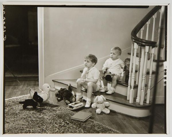 Curator: The weight of worry seems palpable in Dorothea Lange’s photo, "Children of Oklahoma drought refugee in migratory camp in California." Editor: It’s the texture that strikes me first—the visible grain of the film mirroring the harshness of their lives. Curator: Lange's work often carries that symbolic weight. The children’s clasped hands supporting their faces evoke a universal posture of weariness. Their expressions, though individual, reflect shared hardship. Editor: And the materials…photographic paper, silver gelatin. It's a stark, unvarnished presentation, matching the reality faced by these displaced families. It reminds us of labor, both physical and emotional. Curator: There’s a continuity here, isn’t there? The cultural memory of displacement, migration, and human resilience. Editor: Absolutely. This image, made with light, paper, and silver, speaks volumes about social structures and the labor behind survival. Curator: Lange gives us a glimpse into both the symbols and lived experiences of that era. Editor: It is a potent reminder of the materials of suffering and the means through which we document it.