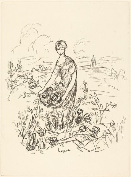 Editor: We are looking at Pierre Laprade’s "Woman Standing beside a Rosebush", created with ink, likely a pen drawing or print. There's something serene yet unfinished about this piece. The lines are so fluid, almost like a memory taking shape on paper. How do you read this composition? Curator: This piece intrigues through its interplay of line and form. Consider how Laprade utilizes line weight. Observe how thicker, darker lines delineate the figure’s essential form, giving her weight and presence. In contrast, the landscape melts into delicate wisps. Editor: Yes, there is definitely a contrast. Why do you think Laprade chose such a minimalist approach? Curator: The economy of line isn't merely a stylistic choice. Rather it encourages the eye to complete the forms, actively engaging the viewer. This approach elevates the composition beyond a simple representation of a woman and a rosebush. It prompts introspection. The sparseness itself becomes a focal element. Editor: So, the medium contributes as much as the subject? Curator: Precisely! The limitations of ink force a focus on the essential structure and rhythmic composition, creating a dialogue between what is present and what is implied. Consider, for instance, how light and shadow are not modeled through tonal variation, but suggested through the density and directionality of lines. It’s almost calligraphic. What do you think that emphasizes? Editor: Perhaps the ephemerality of the moment, or a focus on capturing pure form instead of details. I appreciate how the apparent simplicity belies a deeper engagement with line and structure. Thank you! Curator: My pleasure. It's always rewarding to unpack the visual strategies that elevate a drawing from mere illustration to a work of contemplative art.