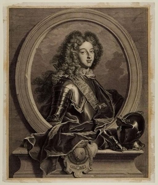 Curator: Pierre Drevet's portrait of (Claude) Louis Hector, Duc de Villars, captures the essence of French aristocracy. Just look at the precision of line, the careful rendering of texture! Editor: It’s dazzling, isn’t it? Almost theatrical. All that armor and ermine seems like a costume for some grand performance. Curator: Indeed, Drevet masterfully employs chiaroscuro to highlight the duke's commanding presence. The gaze is direct, unwavering. Editor: Yet, there’s something a bit melancholy there, too, don't you think? Beneath the bravado, a hint of human vulnerability. Curator: Perhaps. Or it could be a consequence of the medium itself. This isn't just a portrait, it's an engraving, a print. The precision Drevet achieves is remarkable. Editor: For me, it’s the tension between the rigid formality and the very human, almost yearning expression on his face, that really grabs my attention. Curator: A fascinating juxtaposition, wouldn't you agree? Editor: Absolutely! A man and his armour. A visual puzzle that keeps you looking.