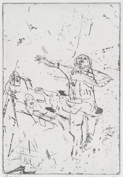 Editor: We're looking at "On the Terrace. Figure composition with four women." by Othon Friesz, created sometime between 1879 and 1949. It’s a drawing from the SMK – the National Gallery of Denmark. It’s pretty sketchy, almost like a first draft. What do you make of it? Curator: The power here resides in its very incompletion. Note how the stark, rapid lines carve out forms from the white background. Consider the dynamism achieved with so few strokes. It emphasizes pure form rather than attempting representation. It is almost an exercise in semiotics – what minimum signals do we need to interpret figuration? Editor: It is interesting how the lines are so spare but the figures are definitely there. So the figures are almost symbols then? Curator: Precisely. Now consider the landscape suggested in the background. Are we truly concerned with geographical specificity, or are we more interested in the visual contrast, the push and pull between near and far suggested by varied line weight? Is this drawing about figures or their relationship to form itself? Editor: It’s interesting that you focus so much on the lines. I would never think that looking at a landscape! Curator: The landscape is a scaffolding upon which to play with those structural considerations, line, depth, contrast. We must acknowledge its importance, but always keep coming back to the fundamental structure of the art. What have we gained by reducing such a scene into near abstraction? What’s amplified? Editor: That makes me see how looking at it less literally almost opens it up. I notice the foreground and background more distinctly now because of how minimal everything is. Curator: And in so doing, the material of art– the application of line–becomes, ironically, the core content itself.