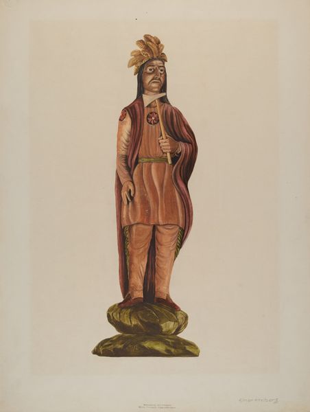 Walter Hochstrasser made this watercolor and graphite painting of a cigar store Indian, likely in the early 20th century. These figures proliferated as commercial signs in the 19th century, advertising tobacco shops in a young America keen to create its own visual language. The image of the "noble savage" was common in art and literature, often romanticizing and distorting Indigenous cultures. Here, we see the figure adorned with feathers and holding a rifle. This imagery was powerful, reflecting both fascination and the brutal realities of colonization and conflict. These objects promoted business, but also participated in the ongoing cultural appropriation and erasure of Native American identity. To fully grasp the historical weight of this image, we can research period advertising, literature, and accounts of Native American life. Only then can we understand how this image participated in constructing narratives about Indigenous peoples. This painting reminds us that art is always entangled with broader social forces.