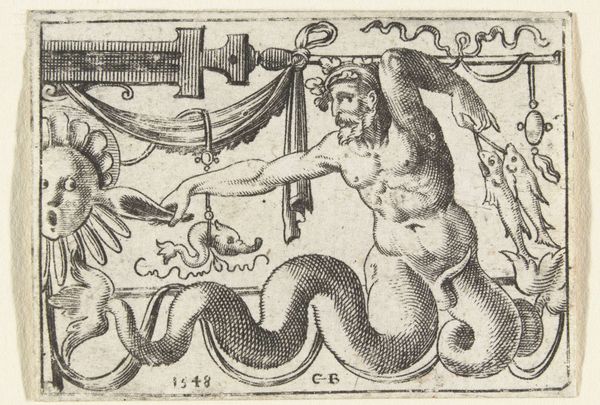 Editor: This is "Triton die op een harp speelt," or "Triton Playing a Harp," made after 1656. It's a drawing by an anonymous artist at the Rijksmuseum. It's whimsical but also, somehow, a bit unsettling. What do you see in this piece? Curator: What immediately strikes me is the way this work uses the figure of Triton to explore the intersections of mythology, power, and representation. Triton, as a masculine sea deity, traditionally symbolizes dominion over the ocean. But here, he's feminized by the act of playing the harp, often associated with more gentle or domestic scenes. Editor: That's an interesting point. I hadn't considered the implied gendering of the harp. So, the artist is challenging established hierarchies? Curator: Precisely. By portraying Triton with a harp, the artist subtly critiques conventional notions of masculinity and power. Consider the historical context: the Dutch Golden Age saw increasing social stratification, but also the rise of new cultural expressions. This piece could be interpreted as questioning the rigid gender roles of the time. How does it strike you in terms of its fantasy aspect? Editor: It does feel deliberately fantastical, a kind of ornamented role play. Is it possible that this elaborate scene is designed for private enjoyment and does not make a point at all? Curator: That’s a great challenge and highlights that while subversive interpretations can feel intuitively appropriate, the piece's function may just be decorative and entertaining! Perhaps we have to look at similar art works and assess those points. Editor: I appreciate your reading of it as potentially subversive. It's made me think more about how seemingly simple images can hold complex social commentary. Curator: And I think the conversation highlighted how to challenge a given interpretation and appreciate nuance!