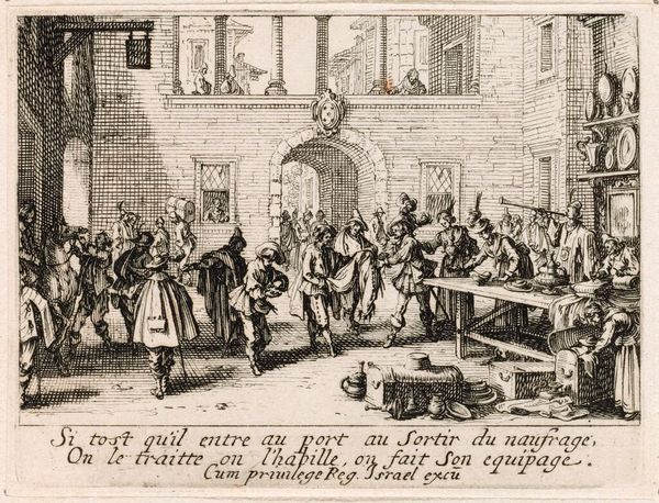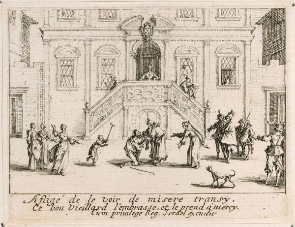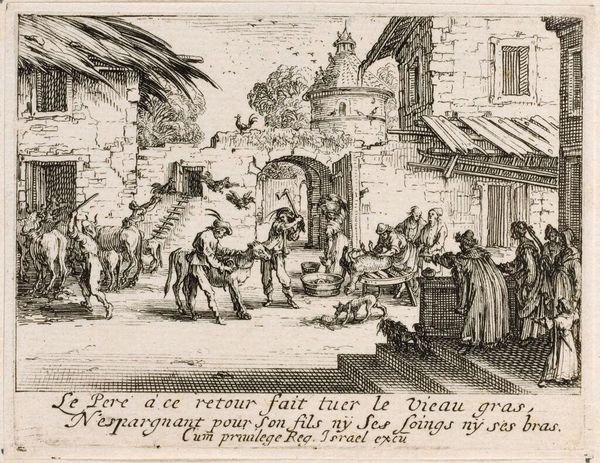 Curator: This etching by Jacques Callot, entitled "Feast for the Returned Prodigal Son," presents a scene of celebration and welcome. Editor: It’s striking how Callot uses such intricate lines to create depth, almost like a stage set, creating a sense of grand spectacle within this tiny space. Curator: Indeed. The symbolism is rich—the returning son is welcomed into a space of music, food, and festivity, signifying forgiveness and reintegration into the family. Note how the musicians on the balcony underscore this atmosphere of joy. Editor: The composition is quite fascinating. The perspective draws your eye into the scene, and the architecture both defines and confines the space, doesn't it? Curator: Absolutely. It's a potent visual metaphor for societal structures and the individual's place within them, resonating with cultural norms of repentance and acceptance. Editor: The density of detail is astounding, given its small scale. It is interesting how such rich visual elements convey universal feelings of remorse and acceptance. Curator: And a testament to the enduring power of visual storytelling.