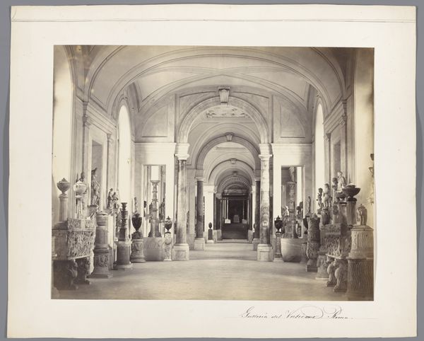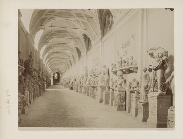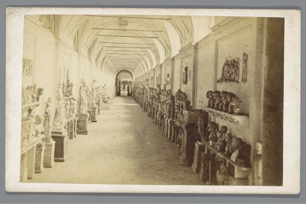 Editor: This is "Interieur van een galerij op de begraafplaats van Staglieno in Genua," a photograph by Alfredo Noack, taken sometime between 1870 and 1890. The repetition of arches and sculptures creates such a powerful sense of perspective. What stands out to you? Curator: What intrigues me most is how Noack, through this albumen print, captures not just the aesthetics of the cemetery, but also the social context. Look at the sheer volume of sculptures – each one a testament to individual wealth and status, bought and consumed as commodities in memoriam. It makes you think about the labor involved, doesn't it? Who were the artisans who produced these works, and what were their working conditions like? Editor: That's a side of it I hadn't considered. I was focused on the artistic aspect, not so much on the production process. Curator: Exactly. We tend to separate “art” from “craft,” but this image blurs that line. These sculptures, though undeniably beautiful, are also products of industry and economic forces. This gallery, captured with photographic materials that required careful manipulation themselves, showcases the intersection of artistic expression, industrial production, and societal values regarding death and remembrance. Do you think Noack's choice of photography – a relatively new technology at the time – speaks to these intersections? Editor: It probably does, yes. Photography was becoming increasingly accessible, mirroring the rise of industrial production in other fields. Using a reproducible medium to capture other reproducible, saleable items... it does tie in. Curator: Indeed. The photograph isn't merely documenting the cemetery; it’s implicating itself within the network of production and consumption. How does understanding the making of the sculptures, and the photograph itself, influence your perception of the photograph? Editor: It makes me appreciate the layers of meaning beyond just the aesthetic. I am now more aware of the social implications of the depicted work, as well as Noack's, which really enriches the experience. Curator: Precisely. By considering the materials and their making, we reveal the interconnectedness of art, labor, and society. It allows us to go deeper than just the surface appearance.