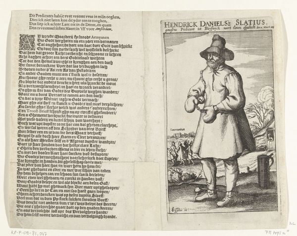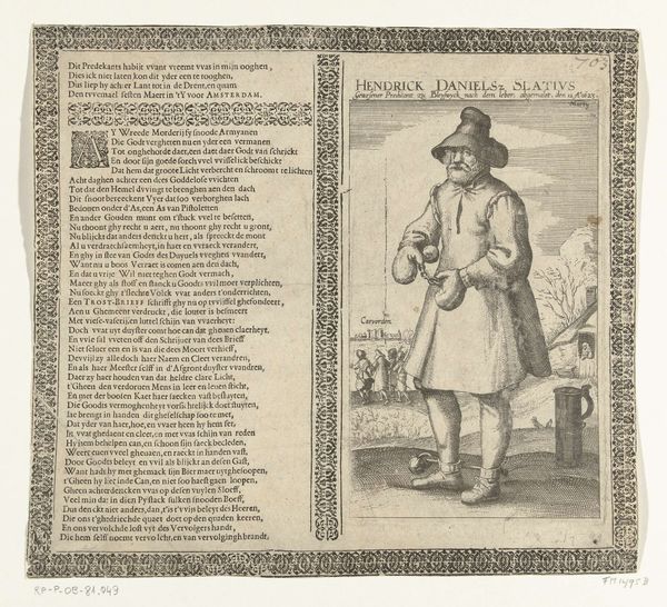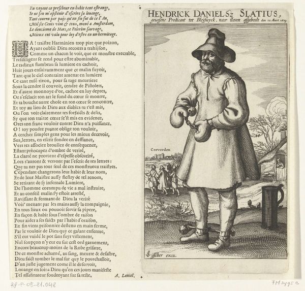 Curator: Let's examine this engraving, "Henricus Slatius, met hand- en voetboeien, 1623," created in 1623. It resides in the Rijksmuseum and is a striking print from the Dutch Golden Age. Editor: It strikes me as unsettling. The confinement suggested by the title becomes immediately palpable with the depiction of the shackles. There's a feeling of desperation hanging in the air. Curator: Precisely. The image meticulously renders Slatius in detail—note the somber realism of his garments, the lines etched on his face, and even the textures defining his form and dress. We are presented with an objective account, the play of light creating distinct shadows to better enhance that feeling of constraint. Editor: For me, the shackles are the most potent symbols, beyond the man himself. Handcuffs and foot restraints represent not only physical captivity but also intellectual and spiritual suppression. He isn't just a man; he's become an icon of the persecution inflicted on dissenters, embodying that fear of restriction, judgement, and cultural division that was clearly relevant then. Curator: Yes, but focusing only on Slatius misses the broader composition. Look at how the text flanking the central image functions visually, a kind of bracketing that intensifies the confinement. It serves both aesthetic and semiotic functions. Editor: Ah, you are right. And consider what else accompanies him – a depiction of a man standing near a modest house. Is that Slatius' own house being taken away? And a brew kettle and a strange scene with tiny, anonymous onlookers. He looks like he is being exhibited or ostracized in public! All the additional symbols surrounding Slatius reinforce this motif of public condemnation. Curator: Undoubtedly. The contrast between the precision of Slatius's figure and the haziness of the surrounding context, the literary inscriptions, all contribute to a sophisticated commentary. The success hinges on its compositional balance. Editor: Yes, the engraving presents us with an intricate symbol and an accessible allegory. Considering the social and religious context, it certainly made a statement. It provides a disturbing, permanent marker of both the person and period for viewers throughout the centuries. Curator: Agreed. Analyzing it formally offers just one window into its depth, a powerful glimpse into its nuanced construction.