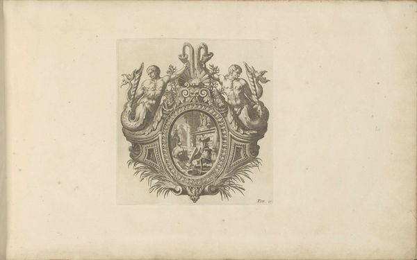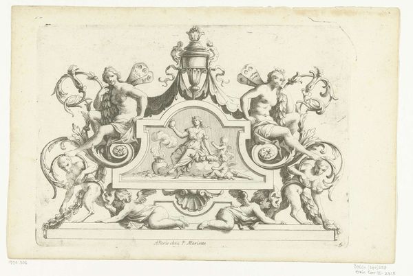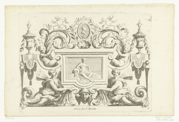 Curator: Here we have "Paneel met Venus en Cupido," a decorative panel etched around 1670-1680 by Alexis Loir, now residing here at the Rijksmuseum. The artist employed engraving techniques to render this piece. What are your initial thoughts? Editor: A riot of swirling lines! The overall effect, especially with the figures, is undeniably decorative and indicative of the baroque era. It is a bit much if I am being honest. Curator: Loir's manipulation of the etching medium itself is fascinating. The dense cross-hatching creates an interesting illusion of depth. Consider also how these printing techniques made such designs accessible for wider consumption, influencing artisans. Editor: I see that. If we examine how line, form, and composition operate within its internal structure, we can detect a specific mode of formal expression emblematic of the Baroque period. The cherubs above, balanced on a pediment, create a verticality offset by horizontally posed reclining figures along the base, thus enacting some visual harmony overall. Curator: Indeed, and consider the material context of these engravings. This wasn’t merely an artistic endeavor but a contribution to the larger sphere of craft production. These images circulated amongst cabinet makers and other decorative artists of the era, so informing popular aesthetic tastes across social classes. Editor: From my perspective, those social aspects are external. More interesting to me are the ways it communicates through allegorical references using well-established classical elements. Venus and Cupid signal love, beauty, harmony; these aren’t simply design elements—they convey codified meanings. Curator: Yet, doesn’t understanding the practical utility of Loir's print in design workshops enrich our viewing experience, and prompt more informed social commentary overall? Editor: To some degree, context helps... But the immediate sensory impression, the calculated balance—that is central. Still, reflecting upon these ornate flourishes as templates for craftsmen offers valuable insight into material culture. Curator: Precisely, it invites inquiry into artistic production as social production! A balance, perhaps, is best struck acknowledging the formal qualities alongside material considerations... Editor: Perhaps we've uncovered the essence of symbiosis: where line meets labor. Thank you for your insights into "Paneel met Venus en Cupido," I was ready to discard it, but now can clearly see there is something in the process as well as the construction of its design.