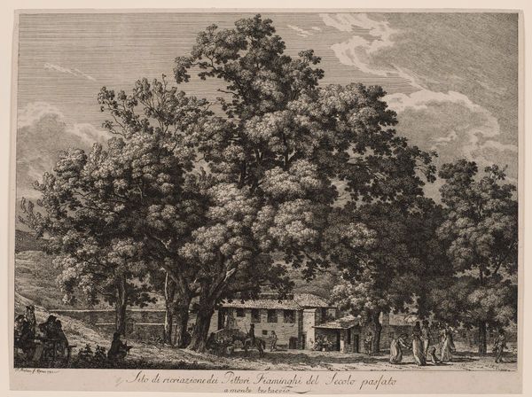 Curator: I’m struck by the serene stillness of this scene. It’s like a pause, a breath in the midst of something larger. Editor: This is "Italian Landscape with Trees (recto)", a watercolor and graphite drawing, completed circa 1815-1821 by Friedrich Salathé. It resides here at the Metropolitan Museum. These plein-air drawings by Salathé remind us of the early 19th century's fascination with both nature and Italy as destinations. Think about how travel and experiencing the landscape firsthand shaped artistic practices then. Curator: I agree; the travel context is important. And it’s more than just documenting a place, right? There is a romanticized vision of the Italian countryside being represented, particularly considering how landscapes function to symbolize liberty and autonomy. Do you agree that it seems deliberately positioned? The pastoral foreground almost serves as a stage, setting up some form of a theater. Editor: Certainly. He has chosen to depict this specific angle of the countryside – we are granted a certain idealized view here. There is an element of framing that is deliberately composed to encourage this sensation of freedom that the natural world enables for the figures within the composition. However, I wonder about how this freedom intersects with the socioeconomic realities. Were such bucolic experiences of travel accessible to most people in that time period? Curator: An incisive point. Whose freedom are we really looking at? The drawing might also unconsciously reveal hierarchies – even the very act of capturing this "untouched" nature becomes an act of appropriation. To unpack this further, it will also be important to observe how the very act of landscape painting at this period may or may not play into existing notions about the romantic ideals of nations, borders and identity during that era. Editor: Well, it certainly presents fertile ground for discourse on class and societal structures in a historical setting. By understanding who has access to landscape and nature at any point in history can definitely reveal quite a bit about power structures and nationalistic goals in general. It is the public role of such paintings like this one, in my view. Curator: Precisely, by considering the intersectionality in artwork analysis, one might get to broader insights and richer perspectives on cultural assumptions encoded within seemingly harmless representations of nature. Editor: A pertinent point of intersection that allows this simple yet intricate composition to take a different perspective and approach with its rich and accessible imagery and context.