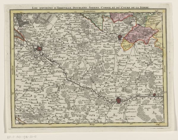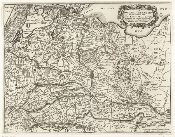 Curator: Here we have an engraved map titled "Kaart van Noord-Brabant met het beleg van Den Bosch, 1629," created anonymously, depicting the siege of 's-Hertogenbosch. It’s printed in ink on paper in 1629. Editor: Oh, wow. It’s intensely detailed; almost overwhelmingly so at first glance. There’s something both precise and almost…dreamlike, even oppressive, about this representation of conflict made by a totally unknown artist. Curator: Exactly. The cartography captures the province of North Brabant with incredible accuracy, but it’s more than just a map, it illustrates the military strategies during that time, complete with troop placements. Look at how the besieging forces encircle Den Bosch. Editor: It’s interesting to observe how even something meant for tactical clarity and potentially celebrating military "victories," takes on a totally different symbolic meaning when viewed far from the time for which it was created, don't you think? I immediately see a symbolic, visual depiction of a world where boundaries and struggles define identity. Curator: Absolutely. The rivers and roads that once were arteries of trade and communication now form pathways of conflict, represented with stark lines and textual notations across the landscape. This adds an extra layer, the constant tension of the golden age’s growth and strife intermingled. Editor: What’s also curious, given the conflict and subject matter, is the level of detail, even bordering on ornamentation. Note how the layout of the print imitates an old tapestry with descriptive typography within elaborate borders. This, combined with the symbolic style of the golden age, transforms a work meant to document battle strategy into almost an exquisite reliquary for all to behold. Curator: It becomes less about objective truth and more about creating a lasting narrative, solidifying the event within the cultural memory through symbolism and very intentional design. It's a powerful statement, that, whether planned or not, invites a re-evaluation of this work. Editor: In many ways, then, it's a record not only of geography and history but also of the psychological landscape of a society grappling with immense changes, an era captured through a conflict’s visual story.