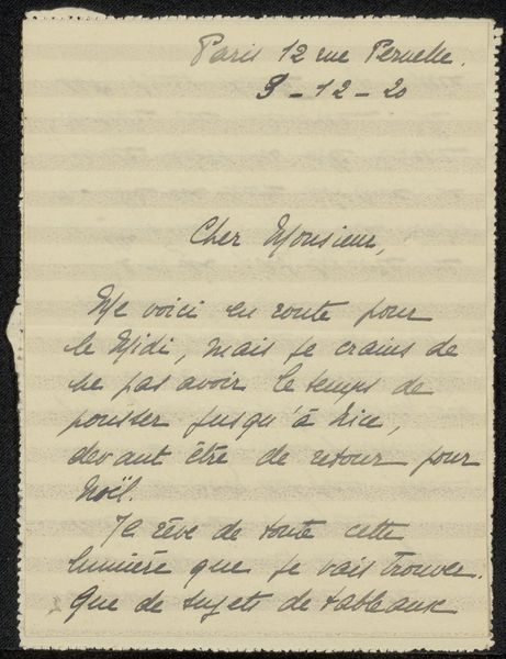 Editor: So, this piece is titled "Brief aan Philip Zilcken," potentially from 1918, created by Hélène van Goethem. It seems to be a photograph of a handwritten letter on paper, done with ink. It evokes a sense of intimacy, almost like glimpsing into someone's personal correspondence. How do you interpret this work? Curator: From a formalist perspective, I observe the interplay between the stark monochrome palette and the textured surface of the paper. The controlled script, though clearly personal, exhibits a careful rhythm and variation in line thickness that gives the text an aesthetic quality beyond mere communication. Note the overall composition: the framing of the handwriting against the photograph’s dark surround. What strikes you about the way the writing occupies the visual space? Editor: I notice the writing feels both deliberate and hurried. There's a density to the text; the lines are close together. Curator: Precisely. Consider how the density of the script creates a visual weight that commands attention. Each word contributes to a structural whole, where legibility exists alongside an undeniable formal arrangement. The very *form* of the letter speaks, quite apart from its lexical meaning. Do you agree? Editor: Yes, I think so. I hadn't really considered the spacing and texture as having meaning in and of themselves, beyond just conveying information. Curator: And that is the essence of the formalist approach: discovering how the visual components create their own independent logic and emotional power. By examining the form and structure of van Goethem’s letter, we have discovered it's not only what the words say, but *how* they’re presented that constitutes its artistry.