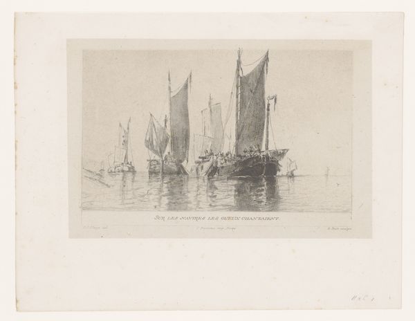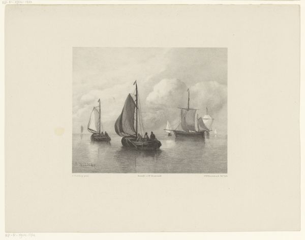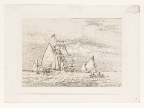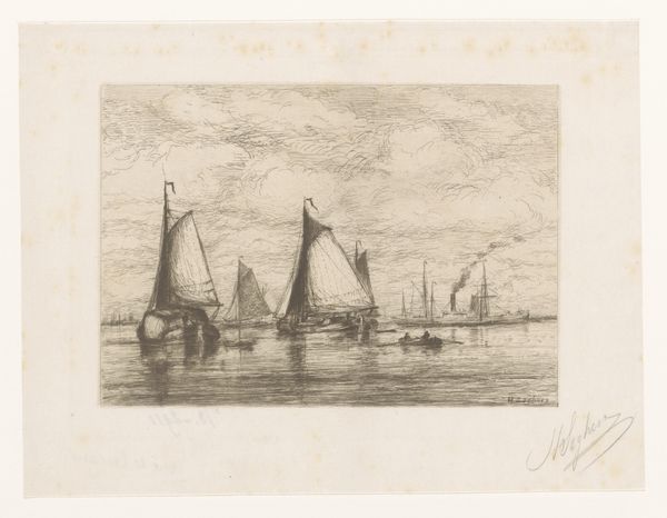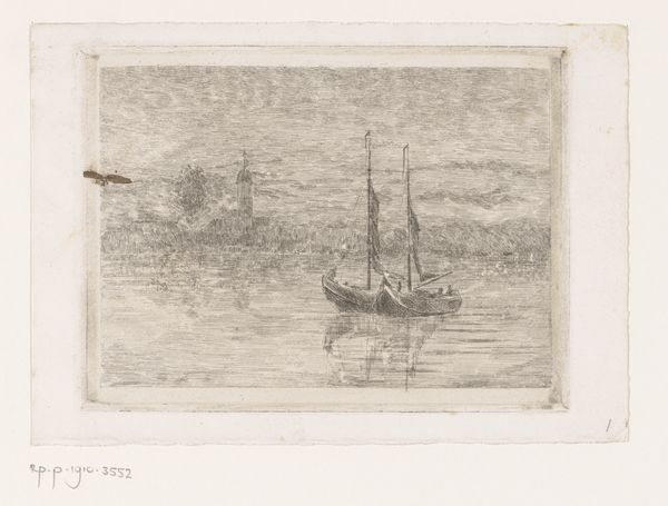 Editor: We're looking at "Gezicht op de Maas," an etching by Alphonse Stengelin, made sometime between 1862 and 1910. It's a peaceful scene, very quiet in its tones. The boats rest calmly on the water. What stands out to you about this landscape? Curator: Well, considering the historical context, I'm immediately drawn to the representation of the Maas. Etchings like this weren't just artistic expressions; they were often circulated as accessible representations of national identity and regional pride. This image, with its humble fishing boats and suggestion of a windmill in the distance, hints at the everyday life of the working class along the river. Do you get a sense of how this image might have functioned as a sort of "postcard" of its time? Editor: Absolutely. It feels less like a grand statement and more like an intimate look at a particular place and time. How would people at the time have viewed such an artwork compared to now? Curator: Back then, before mass photography, prints like these played a significant role in shaping public perception of different regions. This image probably reinforced ideas of Dutch industriousness, connection to water, and a simpler way of life. Today, we might view it with a touch of nostalgia, but we can also recognize how it participated in constructing and disseminating a certain vision of Dutch identity. What do you think about the way the printmaking process influences the feel of the landscape here? Editor: The fine lines of the etching give the water a sense of shimmering stillness. Knowing its purpose – distributing an image far and wide – really shapes how I appreciate the artistic choices Stengelin made. Curator: Exactly! Thinking about the mechanics of production and distribution opens up a rich understanding of the work's place in history. Thanks for sharing your thoughts. Editor: Thank you. Considering how such a simple etching could have carried cultural weight gives me a new perspective.