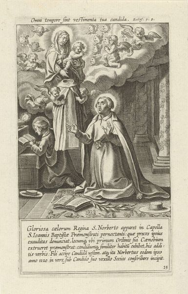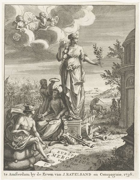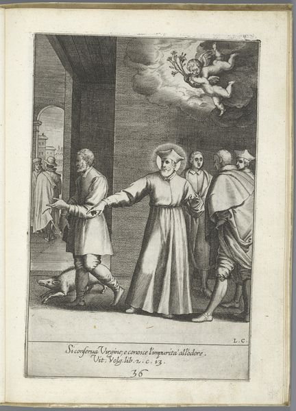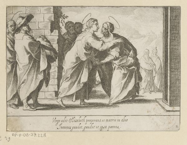 Editor: This is "Visitatie," an engraving made sometime between 1580 and 1600 by Jacob de Weert. The texture created by the engraving is fascinating, and I’m really struck by the dynamism despite the stillness of the scene. What jumps out at you in terms of its formal elements? Curator: Immediately, the deliberate orchestration of light and shadow commands attention, wouldn't you agree? Observe how de Weert utilizes cross-hatching to delineate form, modulating from areas of near-total darkness to surfaces rendered in stark relief. This treatment of light not only imparts a sculptural quality to the figures, but also serves to activate the pictorial space, creating a palpable sense of depth and volume. How do the architectural elements function? Editor: I see, the architectural lines kind of intersect with the figural arrangement which creates a bit of depth. It draws the eye from foreground to background. But the landscape itself almost feels flat because of the engraving technique; the depth is there but also feels somewhat lacking. Curator: Precisely. Note how the controlled deployment of line not only defines contours but also serves to differentiate textures – the rough-hewn stone of the building, for example, versus the soft folds of drapery. This speaks to the artist's technical virtuosity, his mastery over the medium. Editor: So, would you say the focus on the interplay of light and texture overrides any deeper narrative purpose? Curator: One must appreciate the artist's formal sophistication. The work shows a remarkable sensitivity to the inherent properties of the engraved line, elevates it beyond mere representational function. I do think looking at these qualities of the line can lead to insights, yes? Editor: Absolutely, I was focusing so much on what I thought it depicted and missing the core construction of the artwork! Thanks for pointing that out!