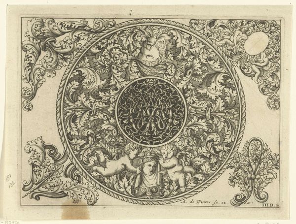 Editor: So, this is “Vijf ornamenten,” or "Five Ornaments," a print made around 1672 to 1676 by an anonymous artist. It looks like engraving, with very fine lines. It's stunning, and almost dizzying to look at with so much going on! What exactly am I seeing here? Curator: You're seeing a powerful assertion of the Baroque aesthetic, where nature is tamed and reformed into these repeating patterns. Think about where these patterns might show up: textiles, furniture, architectural details. How do these decorations reinforce power structures, even in mundane objects? Editor: So these ornaments aren't just pretty, they’re like visual reminders of the order and control during the Baroque era? The wealthy would use this ornament in their home to show that they adhere to societal expectation, a controlled and stylized display? Curator: Precisely. Look at the symmetry. Look at the faces that punctuate the swirling leaves. The "Green Man" is right out of pagan symbology, transformed into a decorative element. What memories and power does he hold from other belief systems? And how is it changed in the artwork? Editor: He does seem… defanged. The natural world is still there, but it's clearly under human control, even domesticated. I see those motifs repeating. Like the circle in the center… it’s mesmerizing. Are there any meanings or stories we could take away from this? Curator: Consider how these images might speak differently to various viewers then and now. Some may recognize biblical or classical narratives woven within these repeating shapes. To some, it’s purely decorative, while others may find something unsettling about taming wildness. Which perspective do you find yourself drawn to and why? Editor: That’s something I didn’t initially consider but changes everything… I think it's more interesting now that I understand that there is an attempt to show power and it really captures that tension, still, after all this time. Curator: Indeed. Cultural memory persists. These forms carry echoes that vibrate within us even now.