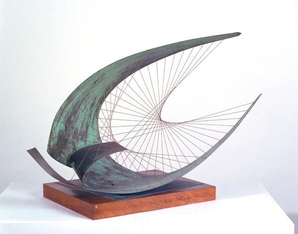 Curator: Right, let’s look at Barbara Hepworth’s "Orpheus (Maquette 2) Version II", currently housed in the Tate Collections. Editor: Wow, it’s like a stringed instrument exploded into abstract form, suspended in mid-air, so delicate. Curator: Indeed, this piece reflects Hepworth's broader engagement with mythology, particularly the story of Orpheus, often interpreted through the lens of gender and power dynamics. The strings create a visual dialogue. Editor: It's like she's trying to capture sound visually, the ghost of a harp's melody, perhaps? I'm intrigued by the base—it grounds the ephemeral nature of the upper form, a quiet strength holding up the song. Curator: A fascinating contrast – the groundedness and the ethereal quality of the sculpture. It could symbolize the tension of Orpheus' journey between worlds, and the limitations placed on female artists at the time. Editor: It’s a poignant dance between what’s held and what’s released, isn't it? Makes you wonder what songs went unsung.