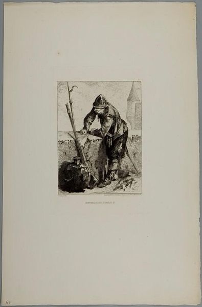 Editor: Johann August Eduard Mandel's "The Widow" is a poignant print. The mother’s gaze and the child's vulnerability evoke a deep sense of sorrow. How do you interpret the symbolic weight of the figures within this landscape? Curator: This image resonates with archetypal themes of loss and resilience. Notice how the boat in the background and the dark shawl allude to a journey, both physical and emotional. The child, a symbol of hope, is held protectively, yet faces away, into an uncertain future. What do you think this contrast signifies? Editor: Perhaps it suggests that even in despair, the future remains open, albeit unknown. The print really captures a complex tapestry of emotion. Curator: Precisely. It serves as a visual echo of enduring human experiences, reminding us of the past's influence on our present.