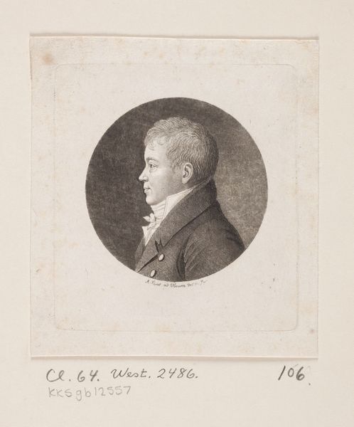 Editor: This is an engraving, "Preben Bille-Brahe," created sometime between 1767 and 1824. It feels like a classical profile, almost like a coin. The starkness makes me wonder what kind of message it conveys. How do you interpret this work? Curator: I see a carefully constructed image designed to convey a specific idea about Preben Bille-Brahe. The profile view itself evokes classical antiquity, connecting him to a lineage of respected figures. The precision of the engraving and the circular frame around the portrait -- does that circular form remind you of anything in particular? Editor: Now that you mention it, that circle could certainly be mimicking a classical medallion. It definitely elevates the subject. Curator: Precisely. These elements are carefully chosen to project an image of nobility, intellect, and perhaps even civic virtue, key values in that Neoclassical era. Notice how the gaze is directed forward. How might that be interpreted in relation to the rest of the engraving's composition? Editor: It does look determined and forward-looking, projecting strength. I hadn't considered the cultural context so specifically, but now I see how every choice supports the overall message of elevated status. Curator: Indeed. And that's often the role of portraiture, especially within Neoclassical art – to immortalize and idealize. Visual symbols work to enforce meaning. It serves as a cultural record and a psychological projection of how the sitter wished to be seen. Editor: I learned that even a seemingly simple portrait can be loaded with cultural and historical information that influences how we read the image. Curator: Precisely. And hopefully, encourages you to think about what any image projects outward into the world, and what it obscures.