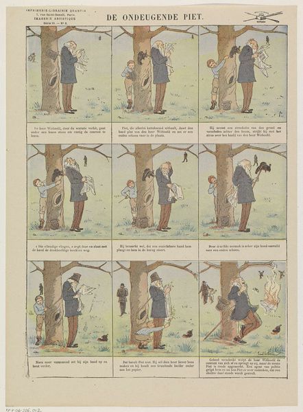 Editor: So this is "Tom en de blinde," dating sometime between 1876 and 1890. It's a print, and I'm immediately struck by its comic-strip style, all these little scenes playing out. There's a definite… well, mischievousness to it, right? How do you interpret this work? Curator: Oh, mischievousness is a perfect word for it! But beneath that light-hearted surface, I see something deeper, perhaps a reflection on societal dynamics. Consider the characters—Tom, the cheeky boy, and the blind man, presented, dare I say, a little stereotypically. Editor: Right, like an older Dutch comic? There is definitely something nostalgic and classic about it. Curator: Precisely! Notice how the narrative unfolds through sequential scenes, each capturing a moment of Tom's...interactions with the blind man. What strikes you about their interactions? Editor: Well, Tom seems to be constantly pranking him! Tripping him, tricking him, generally being a bit of a menace. It’s not exactly kind. Curator: Indeed. Is it simply a reflection of boyhood antics, or does it offer commentary on power, vulnerability, and how society treats those who are different? I wonder… could there be something more to that adorable white poodle as a metaphor? Editor: That’s a fascinating point. I initially saw it as just a funny, light-hearted series, but thinking about it now, there's definitely a darker, more critical edge. Curator: And that, my friend, is the joy of art. It holds a mirror to our world, inviting us to question, reflect, and see beyond the surface. Each viewing may uncover a new hidden truth, perhaps even of ourselves.