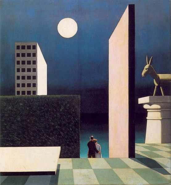 René Magritte made this puzzling painting, Act of Violence, with oil on canvas. Everything is rendered with smooth, even brushstrokes, like an illustration. He wasn't interested in showing off his process. It's all about the image, not the paint. What's so striking is the juxtaposition of things. A blue block with fluffy clouds, a shiny orb, a building seen through an arch, and this framed image of a woman's torso. It's like Magritte is saying, "Here are things; now what do you make of them?" The way Magritte paints these objects—so precisely, so matter-of-factly—it almost makes them seem less real. It's like he's pulling apart the way we look at the world, asking us to question what's real and what's not. Think of the way Giorgio de Chirico's dreamlike cityscapes also play with perspective and invite us to enter into a slightly unsettling world. This piece makes you wonder what else is lurking beneath the surface of everyday life.