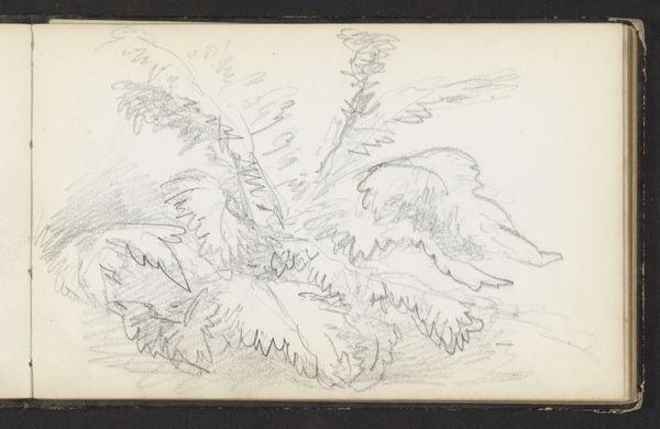 Editor: So this lovely, understated pencil drawing, “Tak van een plant, mogelijk een varen”—“Branch of a Plant, possibly a Fern”—was created by Maria Vos sometime between 1856 and 1870. It's currently at the Rijksmuseum. It’s just a sketch, really, but I find the detail in the leaves fascinating. What do you see in this piece? Curator: I see more than just a study of plant life; I see a record of the artist's engagement with the natural world and a symbol of the era’s fascination with botany. The fern itself, prevalent in Victorian imagery, often represented sincerity and fascination with the hidden secrets of nature. Editor: Interesting. So you see this almost documentary-style botanical drawing as something symbolic? Curator: Precisely. Think of the rise of scientific illustration and the cataloging of flora and fauna during this time. Each carefully rendered detail contributes to a larger understanding of the world, but also implies a sense of the sublime and the infinite mysteries of the biological world that can't be fully grasped by human consciousness. What effect does this close-up depiction of this fern fragment evoke in you? Editor: It does feel almost like a specimen. Maybe she was capturing its essence? Thank you, I never would have thought to see it that way. Curator: Art provides cultural context that is not always immediately clear, offering opportunities to examine shared meaning and value beyond the surface image. I, too, learned something during our chat.