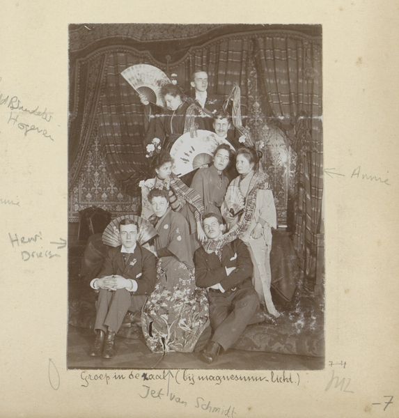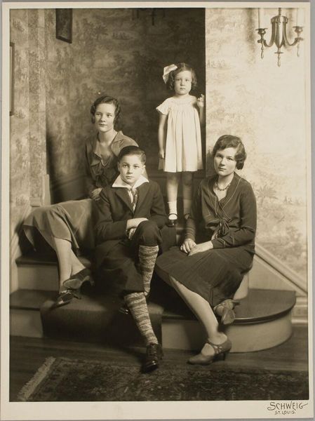 Curator: George Bellows’ "My Family, No. 2," a small etching and drypoint, offers a glimpse into domestic life. Editor: The somber tone strikes me first; there's an almost oppressive stillness in the composition. Curator: Bellows, known for his dynamic depictions of urban life, here presents a more intimate, yet somewhat unsettling scene. We see the artist’s family staged in what appears to be their parlor. Editor: The father looms over the scene, set apart from the others—a stark contrast to the mother and children who are physically connected on the ornate couch. Is he present, yet emotionally distant? Curator: That distance could reflect the prescribed gender roles of the time, where men were often observers of domestic life. Editor: True, and perhaps Bellows is subtly commenting on the performative nature of family portraits, the social constraints that bind them. Curator: Examining this work offers insight into the socio-political context of family during the early 20th century. Editor: Absolutely. And it reminds us of how art can reflect and challenge societal norms—even within the seemingly private sphere of family.