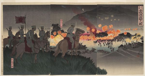 Ogata Gekko made this print of the Japanese army’s great victory at Pyongyang using woodblock printing, a technique known as ukiyo-e, which translates as ‘pictures of the floating world.’ The process begins with a drawing, which is then transferred to a woodblock, usually cherry. Skilled artisans carve the image, and then apply ink or pigment before printing onto paper. The key block, usually in black ink, defines the composition, while additional blocks add color. The final image is a result of meticulous labor, with each print requiring patience and precision. Here, the linear qualities of the woodblock emphasize the violence and chaos of battle. The limited color palette adds to the drama of the scene. Woodblock prints were often produced in multiples, reflecting the rise of consumer culture in Japan during the late 19th century. Understanding the labor-intensive process of woodblock printing, and its place in a culture undergoing rapid social change, helps us to appreciate the historical significance of this image.