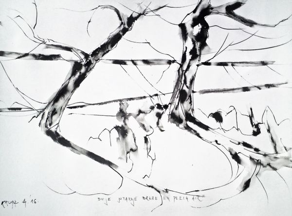 Alfred Freddy Krupa made this watercolor on paper on the 24th of February, 2022. The title, "Black Dawn of Ukraine," tells us that we are looking at a work made in direct response to the Russian invasion. The stark imagery creates meaning through the use of dark ink, contrasting with the white of the page. The bare trees, devoid of leaves, suggest a landscape scarred by conflict. Krupa made this work in Croatia, a nation with its own history of war and invasion. It's important to remember that the reception of art is always shaped by the social and political conditions in which it is viewed. Here, the artist makes an appeal for our attention to the unfolding tragedy in Ukraine. Understanding the social and institutional history of war and peace is essential to interpreting artworks like this. By researching the history of Ukraine and Croatia, we can better understand the artist's motivations and the significance of this powerful image.