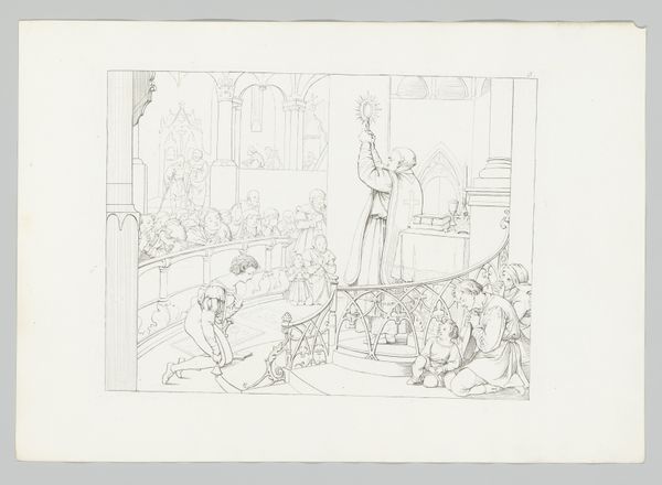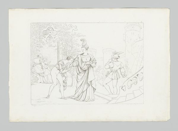 This is "Gerechtigheid van keizer Otto III: onthoofding van een onschuldige" made by Charles Onghena, using engraving on paper. Look closely, and you will notice that the line work defines every detail, from the clothing of the figures to the architectural background. Engraving is a painstaking process, which involves using a tool called a burin to incise lines directly into a metal plate, which is then inked and printed. The marks leave a physical trace of the engraver's skilled hand and labor-intensive approach. In this image, Onghena is reproducing a historical scene of injustice. Note the intricate rendering that would have demanded great skill and time. In the context of printmaking, this speaks to broader issues of production, distribution and consumption of images in the 19th century. Ultimately, "Gerechtigheid van keizer Otto III" prompts us to think about how images, even those depicting historical events, are deeply embedded in the social and economic contexts of their making. This reminds us of the value of craft within the broader landscape of art history.