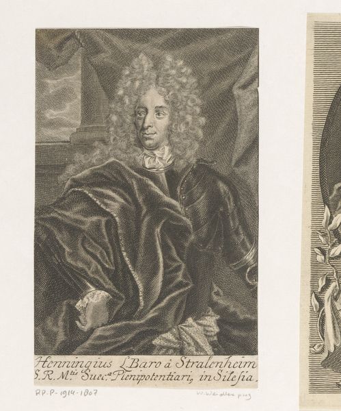 Martin Bernigeroth created this engraving, “Portret van Johann Peter von Ludewig,” sometime between 1670 and 1733. This portrait reflects the cultural values and social hierarchies of its time. Ludewig's identity as a confidant of the Prussian King and a professor is clearly emphasized through the inscription. The elaborate wig, a significant marker of status and intellect, speaks volumes about the performance of masculinity and power during the Baroque era. The formal presentation isn't just about capturing a likeness; it’s about constructing an image of authority and respectability, deeply rooted in class and social standing. Consider how much of identity is performative, constructed through symbols and conventions. This portrait invites us to reflect on the roles we play and the messages we send through our own carefully chosen presentations of self.