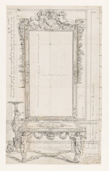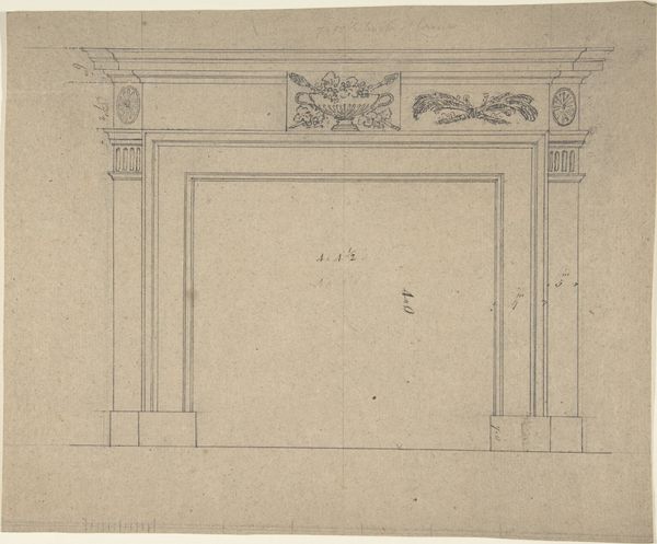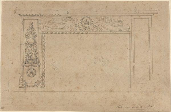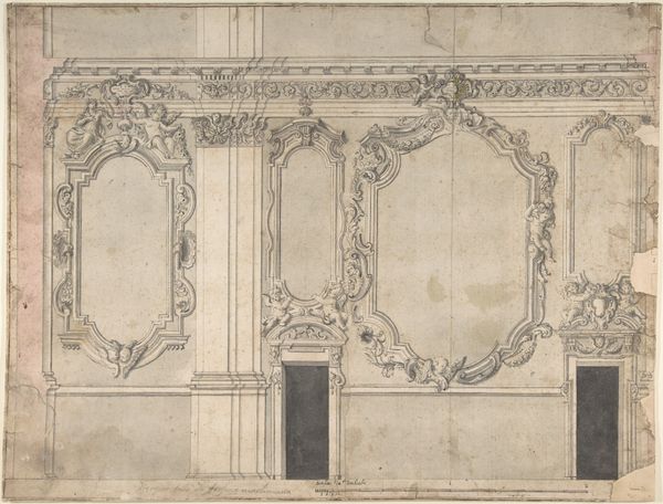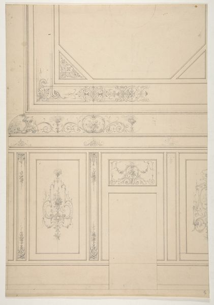 Curator: The drawing you’re viewing is entitled “Paneled Music Room with a Door." It’s an intriguing piece on paper dating from about 1845 to 1855 and currently residing at the Metropolitan Museum of Art. What strikes you most about it? Editor: An almost dreamlike quality pervades the drawing, primarily through the stark contrast of crisp lines with a haze that shrouds some interior design, contributing to a mood that hovers somewhere between order and obscurity. Curator: Indeed, there's something captivating about its construction. Given its academic line style and the level of detailing involved, it seems intended less as an aesthetic piece than as a meticulous visual guide for craftspeople or commissioners. Editor: Precisely. Let’s consider what the image emphasizes: floral motifs, frames and symmetrical arrangements; it may be interpreted as symbolizing balance or harmony desired in cultural and domestic life. Are the drawings included significant icons for that family and are they indicative of their status in society? Curator: These symbols would surely reflect the tastes of the patrons who were commissioning or owning such a space. I’m curious, given the lack of vibrant coloring or specific contextual cues, what meaning may arise out of the raw materiality of the print itself. What type of paper, pigment and printing process informs the value attributed to it by both makers and consumers of the art during that era? Editor: This is especially poignant if one thinks about how symbols, such as garlands or musical instruments are carefully inscribed, offering emotional reassurance of joy and artistic expression, resonating through history with their continued presence on paper! Curator: That intersection—the lasting quality of such images combined with tangible means—reminds us that every artistic pursuit emerges through human effort as an exchange, with each line on the surface leaving clues about history, and maybe the room we would encounter beyond that inviting door. Editor: Well articulated—an ending note indeed to remind all people present that we can seek new perspectives from within artworks by embracing their multiple facets for future reflections.