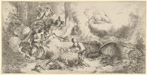 Curator: I find myself immediately drawn to the dynamism within the composition. The gestures, the diagonal lines...it really directs my eye. Editor: That’s a perfect initial read of "The Finding of Moses," a print by Bartolomeo Biscaino, created between 1650 and 1657. The image is an engraving depicting the famous biblical scene. What materials do you suppose defined Biscaino's approach here? Curator: Clearly, the line work dominates. There's a beautiful contrast between the delicate hatching defining the figures and the looser, more suggestive marks creating the landscape. I also want to address the emotional charge. This could almost be called dramatic, despite the quiet, monochrome medium. Editor: And you see that emotion arising solely from within the image itself, not its broader context? The subject—the rescue of Moses—inherently implies themes of power, persecution, and divine intervention, surely impacting Biscaino's approach? The very production of engravings also implies circulation among an expanding reading public. Curator: Certainly, the narrative resonates, yet I would argue the artist manipulates line and form to amplify it. Look how the figures lean towards the child, guiding the viewer’s attention, using visual rhetoric in ways more immediate than, say, mere popular sentiment. The engraving almost vibrates with suspense! Editor: Well, think about where and for whom this was created. Consider the patronage system of the period and its impact on the imagery chosen and disseminated, from subject matter to line economy itself! What do you feel might the workshop culture or the printmaker's access to particular grades of metal have brought about, as to its lasting legacy? Curator: That's interesting food for thought. Editor: The history of material informs my assessment of meaning, and the symbolic and real roles played out in works. Curator: And while I do not disregard the making process or the hands that labored over this plate, I champion the intrinsic qualities as signposts for interpreting its eternal, affecting drama.