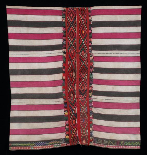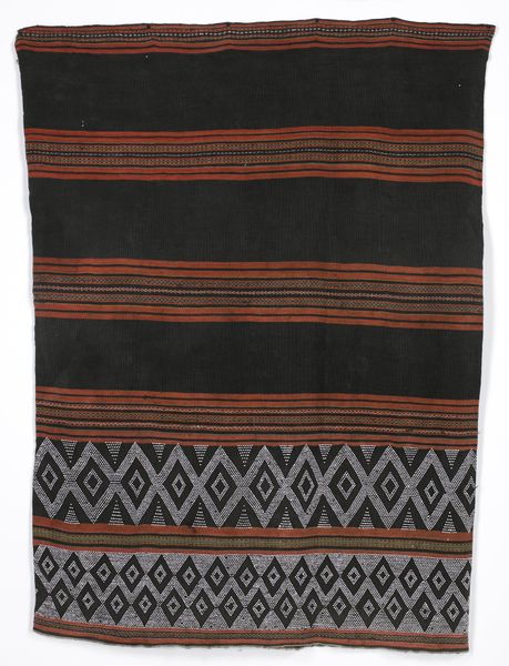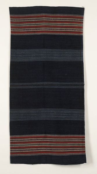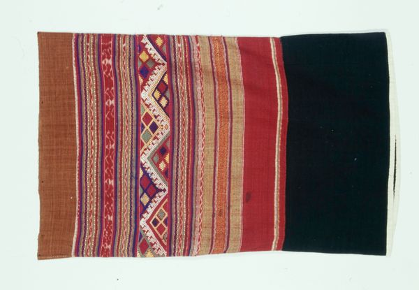 This tube skirt was created by an artist of the Khmu people using cotton. Isn't it interesting how an object like this can speak? I'm drawn to the way the bands of color interact with the solid black field above. This contrast sets up a kind of conversation between restraint and expression, structure and freedom. Look at the subtle variations within the stripes: the shifts in hue, the slight imperfections. There's a real sense of the hand at work, of a process unfolding organically. The texture is so tactile, you can almost feel the give of the threads as you imagine the weaver at the loom. The more you look the more the colors come to life, each one humming against the others. You know, this reminds me a little of the work of Anni Albers, who brought a similar painterly sensibility to her weavings. I think both artists show us how even the most functional of objects can be a site of deep aesthetic exploration.
