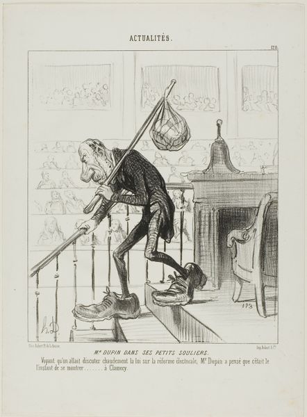 Honoré Daumier made this lithograph, titled "Salut! Terre de l'hospitalité...", in 19th-century France, using lithographic crayon on paper. Daumier was known for his satirical prints, and this one offers a sharp commentary on the politics of immigration and national identity. The image depicts a man arriving at the "Douane de Belgique," or Belgian Customs, raising his hat in a gesture of thanks. Daumier uses caricature to critique the idea of Belgium as a haven for those unwelcome elsewhere. The figure’s exaggerated features and theatrical pose suggest insincerity. Boxes nearby are marked ‘HD’—perhaps a reference to the émigrés or the goods they have brought over the border. Such prints played a crucial role in shaping public opinion, using humor to challenge social norms. To understand Daumier's work better, we can look at the political climate of the time, exploring newspaper archives and other prints to grasp the nuances of his critique. The meaning of art always relies on its context, and its power lies in its ability to reflect and challenge the society that produces it.