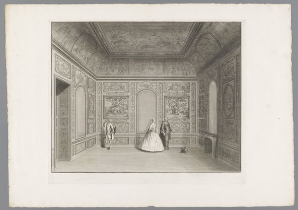 Salomon Kleiner made this print of Weissenstein, a baroque palace in Pommersfelden, Germany. It depicts the lavish interior, specifically a cabinet filled with mirrors and porcelain. The image itself operates as a status symbol, showcasing the wealth and refinement of the elite during the 18th century. Kleiner's detailed rendering of the ornate decorations, the porcelain figurines, and the mirrored surfaces all speak to the culture of collecting and display that was central to aristocratic identity. The figures within the room, elegantly dressed and engaged in refined conversation, reinforce this image of aristocratic leisure. The production of prints like these was often linked to institutional patronage. Kleiner's work was supported by wealthy patrons who sought to document their holdings and promote their status, which can be further understood by examining estate records. It is through this kind of historical research that we come to understand the social conditions that gave rise to art.