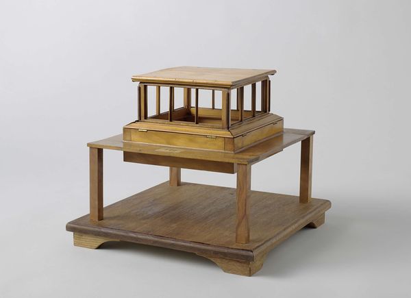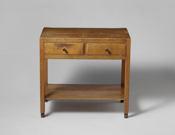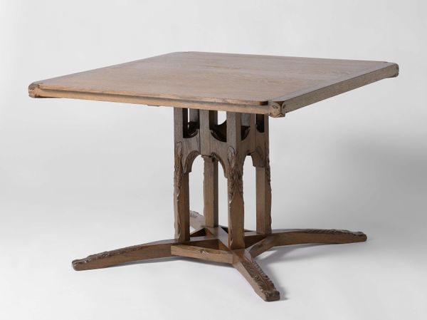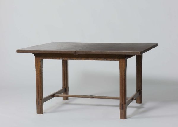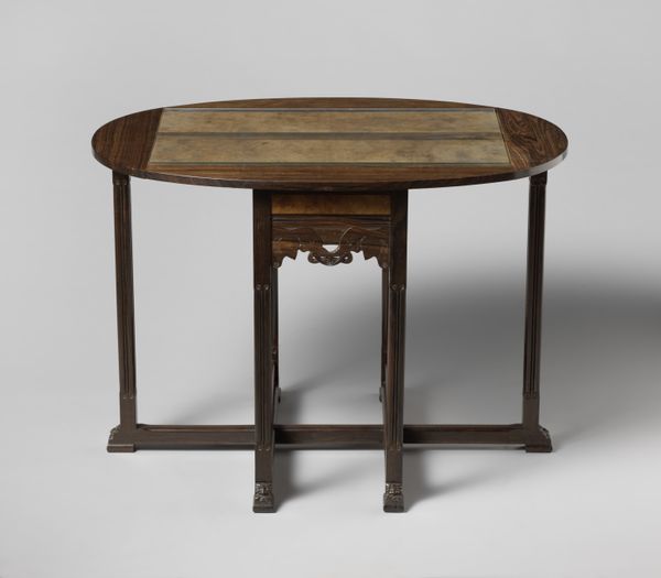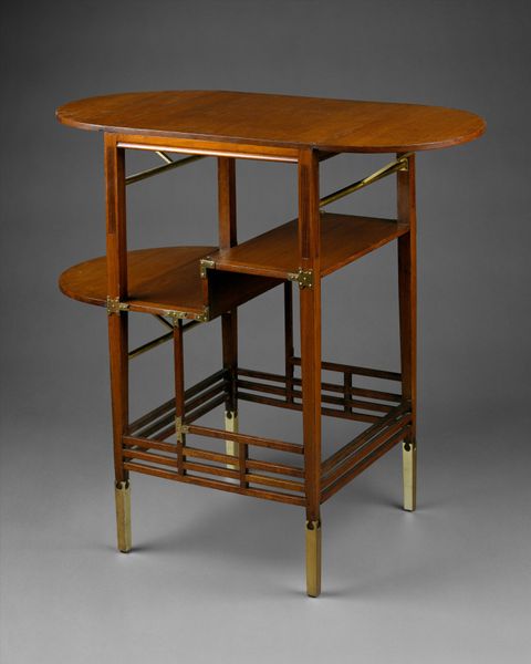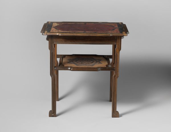 Curator: This elegant tea table, crafted around 1910 by Theo Nieuwenhuis, invites a closer look at the Dutch Arts and Crafts movement. You can find it here at the Rijksmuseum. Editor: Immediately, I notice its quiet sophistication. The wood grain is so prominent, and that openwork detailing along the sides gives it such an airy feel. Almost like a restrained exuberance, wouldn't you agree? Curator: Absolutely. Nieuwenhuis and his contemporaries aimed to elevate craftsmanship. This table speaks volumes about the values inherent to that period. By placing handmade quality at a premium, it served to promote that ethos within the art world. Editor: Look at how the removable tray fits perfectly onto the stand; you can also see such clear evidence of joinery. It speaks to a level of skill often lost when furniture becomes mass-produced. Was Nieuwenhuis involved with a specific workshop? Curator: Yes, he was prominently associated with 't Binnenhuis, a design firm in Amsterdam. 't Binnenhuis sought to democratize design by offering well-crafted furniture to a broader audience, attempting to bridge the gap between art and everyday life. They even advocated against the traditional divide between different decorative arts like woodwork, metalwork and glass, for example. Editor: That makes perfect sense. This isn't just furniture; it's a statement about valuing labor and materials. The 'bonenmotief,' as it’s described—the bean motif—further suggests a connection to the earth, a subtle nod to organic forms within the rigidity of its geometry. Curator: Exactly. The Arts and Crafts movement often looked to nature for inspiration as a way of escaping the sometimes brutal industrialization in Western Europe. Furthermore, furniture pieces such as these occupied important roles as symbolic items. Consider the bourgeois family sharing tea, and the various signifiers that communicate throughout this small gesture. Editor: The very act of gathering for tea itself is elevated, then, becoming a miniature stage for social rituals centered around an object made with such careful attention to process. To consume using such beautiful items, or have those items visible within your private salon or living room—that is what sets you apart and expresses certain social positions. Thank you! Curator: Thank you, hopefully the next time people stop and admire this table, it becomes apparent how significant an object it truly is!