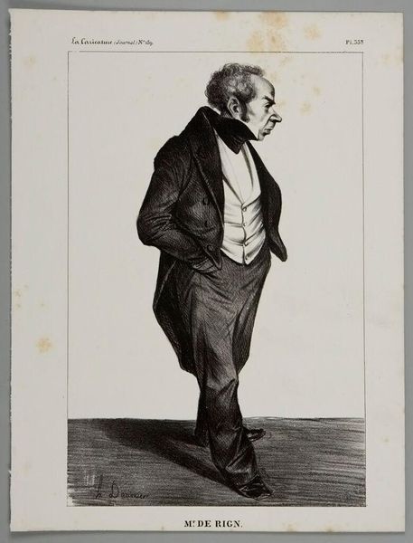 Editor: So this is Honoré Daumier's "Comte Horace Sébastiani" at the Harvard Art Museums. It's a black and white print and the figure is a bit...caricatured. What do you see in this piece? Curator: Daumier was a master of social critique. Consider the context: post-revolution France, a society grappling with class divisions. This image isn't just a funny drawing; it's a commentary on power, specifically the inflated ego and perhaps outdated relevance of the aristocracy. How does the figure's posture strike you? Editor: I guess he looks a little pompous. Is that intentional? Curator: Absolutely. Daumier exaggerates physical traits to expose inner character. Think about the role of satire as a tool for social change. This print challenges us to question who holds power and how they wield it. Editor: So it's not just a portrait, it's a political statement. Curator: Precisely. And that's what makes Daumier so compelling even today.