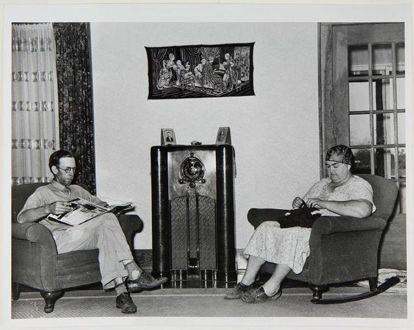 Editor: This photograph by Martin Schweig captures a woman opening a gift in St. Louis. It feels like a glimpse into a specific moment, almost like a staged tableau. What do you see happening here? Curator: It’s a fascinating document of mid-century American culture. The composition speaks to a specific social performance. The gift-giving ritual, the attire, even the visible Marlboro cigarettes, all point to an affluent lifestyle and carefully constructed public image. Who is this performance for? Editor: That's interesting, I hadn’t considered it as a performance. So, it’s less about the intimacy of the gift and more about outward appearances? Curator: Precisely. Photography, especially in this era, played a significant role in shaping and reinforcing societal ideals. Schweig's image becomes a lens through which we can examine the aspirations and anxieties of the time. What is being projected, and what is being concealed? Editor: I see your point. It's a far more complex picture than just a simple moment. Thanks!