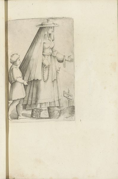 Curator: Isn't she striking? This is "Vrouw met kind, afkomstig uit Tripoli" or "Woman with child, from Tripoli". It's an ink drawing by Léon Davent, created sometime between 1555 and 1568. Editor: Absolutely. There's a powerful stillness, even solemnity, in her posture and gaze. It's almost like a Madonna, but with an earthiness to it. A very *human* Madonna. Curator: Exactly. Davent captures this moment of intimate care but with a hint of worldly concern in her expression. It carries the gravity of her lived experiences, especially if we see the text which identifies her as from Tripoli. The drawing embodies a lot in that one gaze. Editor: Tripoli was an important center of trade in the Mediterranean. In an image from Europe, I see the symbol of her headdress becoming something different: both protection and social mark. How does Davent see this? Does this work also serve to essentialize her as Other? Curator: That’s a vital point. Given the context of 16th-century Europe and its increasing interactions with other cultures, such depictions were not simply about portraying an individual. Here, Davent blends curiosity and perhaps even a little "orientalism", but with obvious human feeling and attention to the tender relation to the child. He does something complex, I think. Editor: And those bare feet planted in the earth! Again, we return to this essential human condition... to maternity, hardship. The feet signify a kind of stark reality—perhaps even vulnerability, but at the same time, strength. They echo centuries of images connecting humanity to Earth. Curator: It's remarkable how he achieves so much depth of meaning through such economical lines, right? It is, in the end, a rather simple composition. A standing figure, a child cradled. Editor: Well, maybe the apparent simplicity is the key. It makes the gaze, that connection with the viewer, all the more piercing. In her glance, a world. Curator: Agreed. Ultimately, it's about acknowledging that universal experience – the powerful, complex bond between a mother and child – regardless of where she's from. It bridges those cultural distances, doesn't it? Editor: It makes me wonder what other stories we can find woven within the symbols presented to us and reminds us that every portrait reveals a world far beyond its borders.