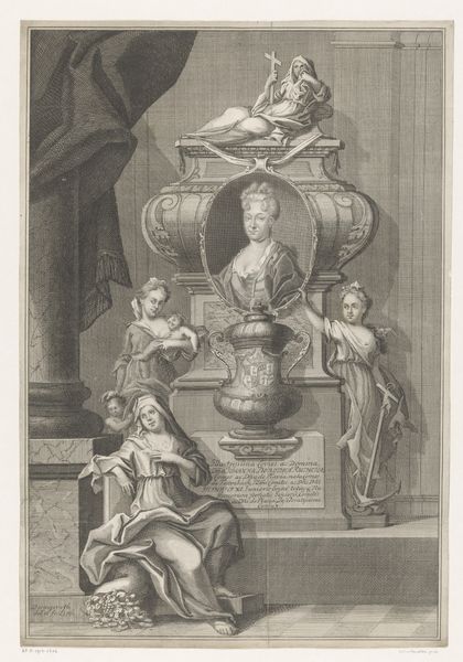 Curator: This engraving, titled "Portret van Ott," produced between 1680 and 1733 by Martin Bernigeroth, presents an interesting study in Baroque allegorical portraiture. The work is part of the Rijksmuseum collection. What strikes you initially? Editor: The stark contrast immediately pulls my eye. The artist utilizes dense, almost textile-like hatching to define forms and textures, contrasting with the areas left relatively untouched and spare. One wonders about the tools used to carve these intricate lines. Curator: Indeed. Bernigeroth's technique emphasizes clarity of form through the use of line. Notice the strategic use of the flowing drapery which directs the viewer’s gaze towards the central portrait of Ott, lending an air of elegance and status to the figure. Semiotically, this could speak to power and prestige, visualized via very intentional graphic language. Editor: It also looks quite efficient. The cross-hatching, although highly detailed, gives me the sense that the artist worked to minimize the amount of material used, thinking economically. And then there's the question of scale. Prints afforded the possibility of replication. Was the intended effect purely aesthetic, or also propagandistic perhaps? How would it circulate? Curator: The incorporation of classical motifs certainly speaks to something beyond mere portraiture. The allegorical figures add layers of meaning. They transform what could have been a simple likeness into a complex symbolic statement. Editor: The means by which this allegory functions are crucial: Bernigeroth's engagement with labor, skill, materials—and, above all, social access—are at the very heart of his approach, blurring the lines between high art and artisan craft. One must see both production and the resulting composition together, hand in hand. Curator: Very well said. Considering the work’s formal composition and historical context alongside material considerations enhances one's interpretation of "Portret van Ott." Editor: Precisely. By investigating method and social intention, our experience with the visual form becomes much more vibrant.