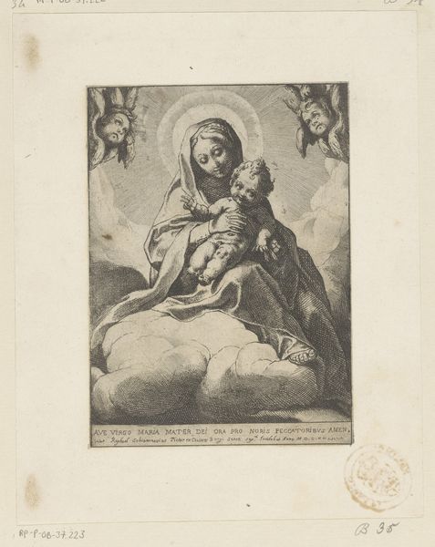 Curator: This is Claude Mellan's "H. Lucia," an engraving that, judging from its style, was likely crafted sometime in the 17th century. Its linear quality gives it a distinct Baroque feel. What captures your eye initially? Editor: It's haunting, in a way. The light source feels almost supernatural, bathing the figure in an ethereal glow. It has an almost uncomfortable serenity. Curator: Mellan’s expertise in line engraving truly shines here, wouldn't you agree? The textures, especially in the drapery and Lucia's hair, are remarkably rendered using just a single tool and line variations. Editor: Absolutely, it’s like he’s using geometry to evoke emotion, the way those radiating lines almost pulsate from behind her head. There’s something potent in its visual rhetoric. Lucia, in religious iconography, of course, is the patron saint of sight. But the composition does something interesting by shifting our own vision, forcing us to interpret, to engage. Curator: You are right, Saint Lucia is usually portrayed holding her eyes on a plate. Here she holds what looks like a chalice and a palm leaf. This challenges our immediate understanding of who this saint is; making us reflect on her representation throughout history. Editor: And perhaps Mellan asks us what we *choose* to see when we look at someone. Think about her story and martyrdom being used throughout time to encourage young women to embrace patriarchal religion... Curator: An interesting reading, indeed, to bring feminist analysis to the fore. The delicacy of line contrasts powerfully with the harsh reality of Saint Lucia’s history. Editor: This delicate yet defiant rendition really invites reflection on visual stories, and who is writing them, as much as the act of sight itself. Curator: A lot of perspectives to consider in such a delicate rendering of the Baroque.